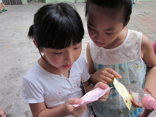 历险之旅的最后一个环节是寻宝游戏,每个班级的学生要根据寻宝线索里面提供的老师特征寻找出那位老师后,就可以得到一份“厚礼”——老师们写给每位学生的心里话。当找到“宝藏”后,每个孩子都小心翼翼地打开纸条,细细品读老师们的寄语。“You are so cute.”“要好好听爸爸妈妈的话哦!”“老师相信,只要努力,你就是下一个比尔盖茨。”……小学生们一个个摸着小脑袋,似懂非懂地点点头。但从他们澄澈的眼睛里,我们却看得出,每个人都把小纸条视为珍宝,这也是他们的天真单纯之处。