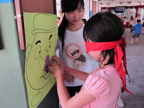 “贴鼻子”摊位也同样人气十足。被红领巾蒙住双眼的学生一个个“摸黑”前进,到达目的地后,便试探性地摸了摸贴在柱子上的头像,然后又暗自比划,有的把鼻子贴在了眼睛上,有的则贴在嘴巴上,引得围观的同学阵阵大笑。然而,当鼻子正确“归位”时,周围同学也不吝啬于送给他热烈的掌声。