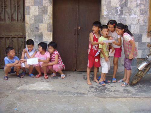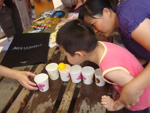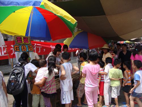于是,在村民们好奇的眼光中,我们的活动便展开了。我们的活动形式是与亚运知识有关的游戏大闯关。游戏有三关:第一关我演你猜;第二关吹球水上漂;第三关是亚运知识问答。活动刚开始,大家都只是在旁边围观着,没有人愿意第一出来玩,尽管我们在旁边又是介绍,又是拿景致的礼品诱惑,又是亲身示范,浑身解数都使尽,仍是没有人愿意试。终于,来了一个五六岁的小男孩,被我们的礼品给吸引了,我们“连哄带骗”带着他闯过了三关,按照游戏规则,我们送给了他一支很景致的笔。接下来,围观的那些小朋友全被吸引了过来。于是活动便在笑声中紧锣密鼓的进行着……