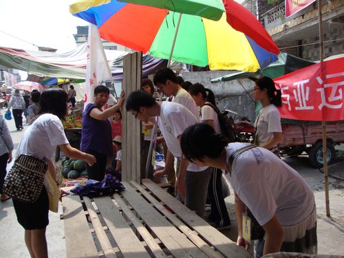 来到社区,一直陪着我们的李姐帮我们物色了一块空地,但是这里没有像学校搞活动那样有桌子和帐篷,也没有大树可以挂横幅。正当我们为难的时候,李姐到街坊邻居那里帮我们借来了木板和桌子,于是,就和大家一起动手拼起了一张简易的桌台。于是大家七手八脚的忙起来,不一会儿,我们的游戏摊位便装饰好了。由于周围都是买水果的摊位,所以我们的摊位显得特别抢眼,吸引了很多人。当我们把准备好的景致的文具礼物摆放出来更是吸引了很多小孩。
