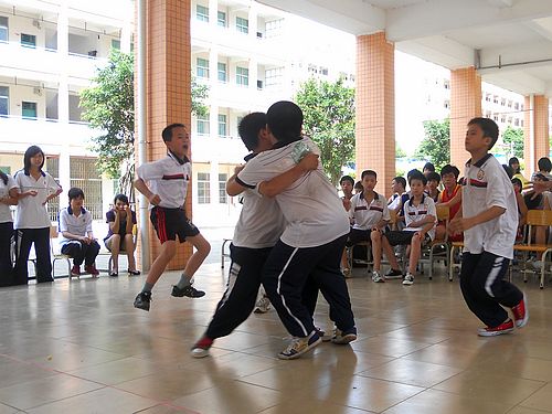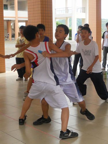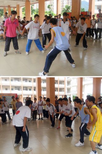 本网讯 7月27日下午2时,商英学院首届卡巴迪六校联赛在阳春一中教学楼中庭火热开赛。为了迎接亚运并推广亚运特色项目卡巴迪,商英学院特意筹办了本次大赛。2010年三下乡阳春分队所在的六所学校——阳春一中、圭岗中学、潭水中学、河口中学、马水中学、逸夫小学分派一支队伍参加比赛,阳春一中英语组组长王德志,逸夫小学谢日光副校长、刘琼飞主任,圭岗中学赖碧波主任与商英学院三下乡总队队长巫丽君应邀观看比赛,精彩赛事更吸引了阳春电视台前往采访报道。大赛分小学、初中、高中三个组别,各组赛况激烈,各队选手团结协作、发挥出色,比赛在热烈的欢呼声中掀起一轮又一轮的高潮。