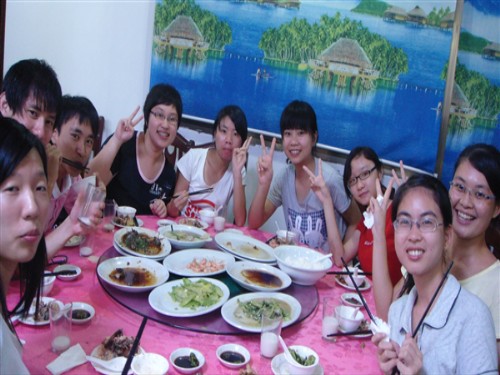 傍晚6点半,我们应邀到学校附近的一间餐馆进餐。席间,校领导们跟同学们一一敬茶。校领导的热情让我们有点不知所措,意外之余又有感动。这一顿晚餐很丰盛,队员们很愉悦地品尝美味的佳肴。晚餐中有一道当地特色菜式——蒸泥鱼,调研组之前曾研究民间艺术装泥鱼。经过校长的介绍后,队员们对泥鱼有进一步的了解。