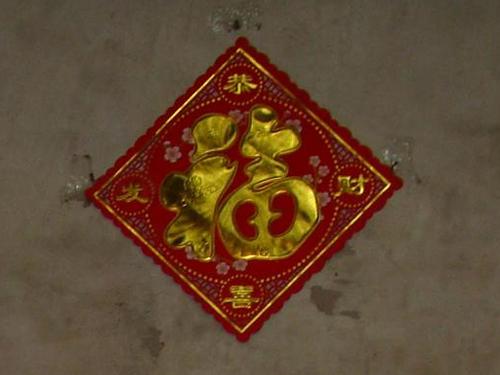 大大的福字贴在小小的厅堂墙上