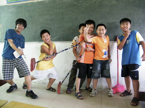接着,谭导师主持节目,小小的讲台成了一个创意无限的舞台。首先,班里颇受欢迎的小乐队自告奋勇献上一首《真心英雄》作为生日礼物。只见班长俊铭一手提帚当作吉他弹奏,令一手摹仿麦克风,深情演唱。有“小博士”之称的浩员在一旁手持歌词,身体跟着音乐的旋律轻轻摇动。有着动人歌喉的贤基在一旁哼唱着,高举着小手打着节拍。小寿星们站在一旁,高兴得手舞足蹈。