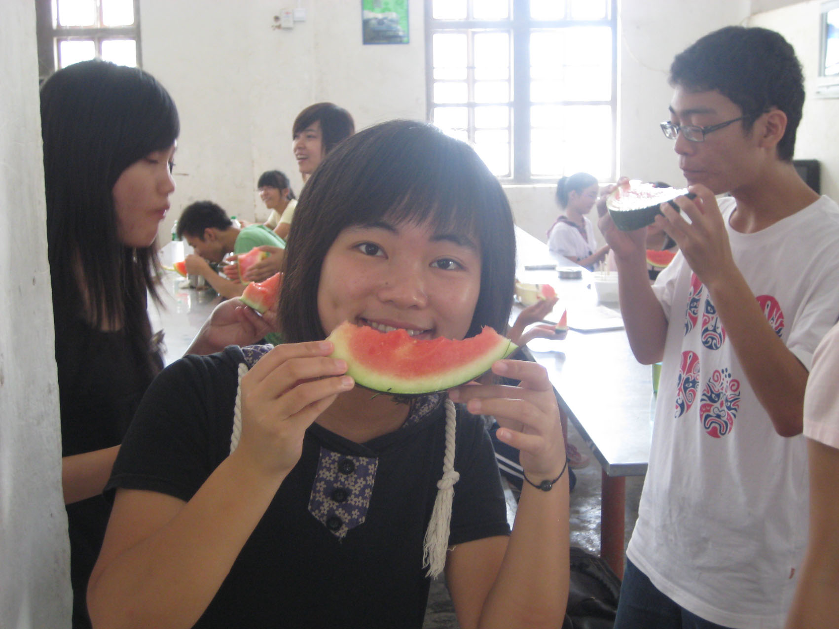 七月的天气,骄阳失火,队员们每天都精力十足的投入工作,当然离不开后勤组人员的悉心照顾,每天贴心的天气报告、严格的卫生制度,为了增进队员间的感情、活跃队伍的气氛,后勤组今天还组织了队员们在潘中饭堂吃西瓜,鲜红甜美的西瓜,既解暑又解压,队员们还不忘与当地的小朋友们分享,一个个的吃的合不拢嘴。