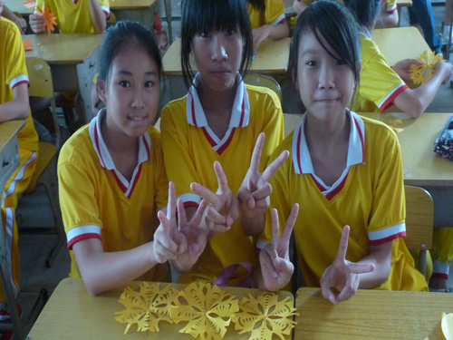 炎炎烈日,学生们对“雪”的兴趣特别高。课堂上,老师们不仅亲自示范剪雪花的各个步骤,还手把手地教学生,而学生们也非常积极配合老师。在制作过程中,当学生们不小心剪断雪花,义教的老师们就会鼓励他们“伟大的艺术家的作品总有一种缺陷美”,而学生们也非常享受这一赞誉。课堂中笑声不断,充溢着浓浓的师生情。尽管材料数量有限,学生们只能相互借用剪刀,但这并不影响学生们的“艺术雪花”的质量。很多学生不仅完成了老师的任务,还自主创新地剪了一些精美的图案并争先恐后地在镜头面前“炫耀一把”。
