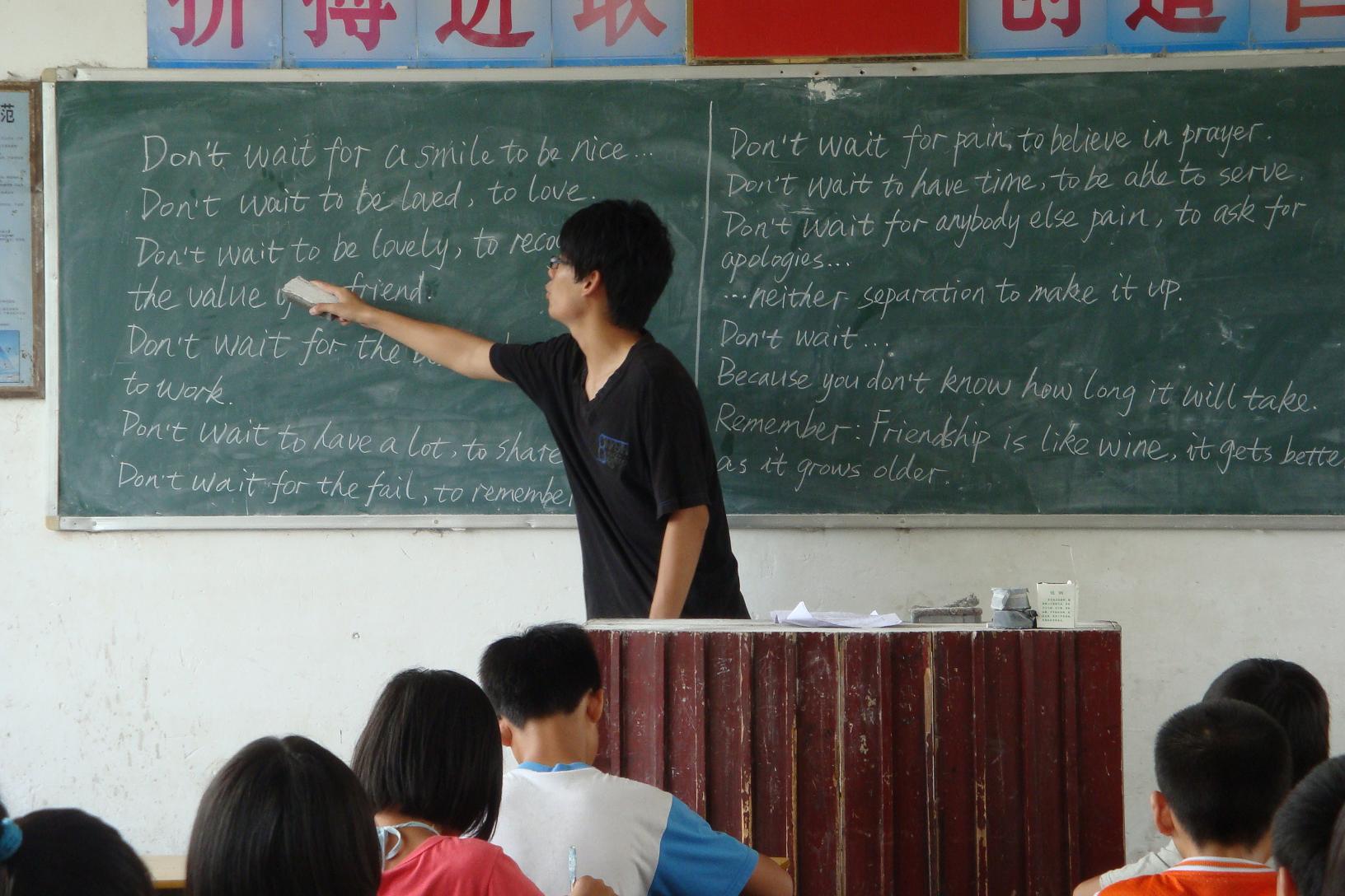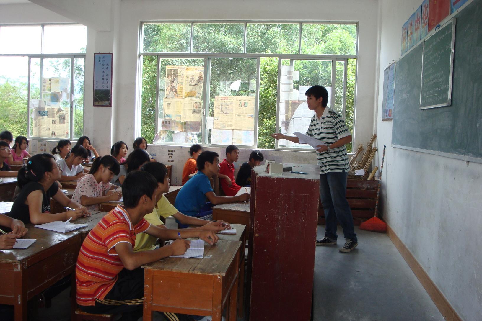 22日,教学楼停电了,简陋的教室里面最为“抢眼”的风扇都不转了,老师们在讲台上是汗流浃背。但是,没有一个人埋怨,也没有一个人想要放弃。就算是热得非常难受,也都只是下讲台擦擦汗,喝口水又笑容满面地继续讲课。学生们的口语水平差,一个英语单词只要超过8个字母,读起来就非常吃力,老师们只能不停带读,不停纠正。虽然枯燥,但哪怕只有一位学生读准了,我们就已经觉得很值得。