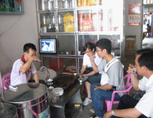 面对陌生人,常人总会产生警惕的反应,这也是调研组成员所担心的问题。但是,今天的调研比组员所预想的要顺利、开心了不少。虽然,茶庄、茶店的老板在被调查之初难免会对组员表示疑惑,但在他们知晓来意后,都很乐意接受访谈,并用本店铺的茶水招待各位组员。