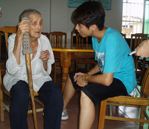 队员们很热情地走到老爷爷老奶奶身边,向他们问好,然后搀扶着他们到客厅里。每个队员都照顾着一两个老人,陪他们聊天,像孙子孙女一样嘘寒问暖。为了逗老人开心,队员们使尽浑身解数,展现各种才艺,有的唱歌,有的跳舞,有的表演武术,还有两个同学扯着嗓子唱戏剧,老人家们开心地看着,听着,乐呵呵地笑,有几个老人是眼睛看不见或者耳朵听不到的,也高兴地鼓着掌,气氛很是热闹。队员们还细心地把三个大西瓜切成一小片一小片地送到老人的嘴边,吃完了还帮他们擦脸擦手,场面甚是温馨。