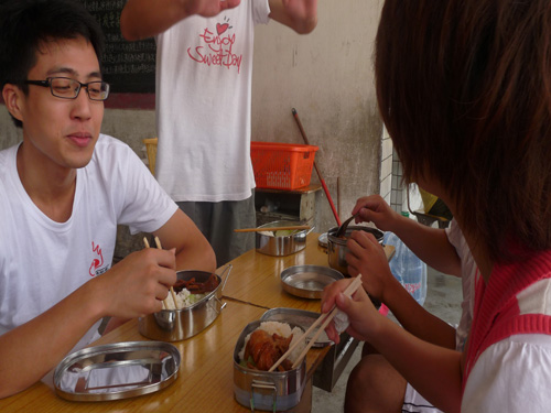 每天一到就餐时间,他们都准时把大家的饭盒运去饭馆盛饭再运送回来;每一次各组需要采购物资,他们都不辞劳苦在人生地不熟的街道奔波,有时甚至走上两、三个钟头;每到要干粗重活的时候,他们总秉着先锋队的精神全心全意地劳作。后勤组成员辛劳地照顾着每个成员的起居饮食,在又省又好的原则下尽量地满足每个成员的生理和心理上的需要,默默无闻地为大家服务,风雨不改。我们看在眼里,记在心上,每每看到他们美丽的背影在风雨与烈日中挺立着、坚持着,我们都被深深地感动着。