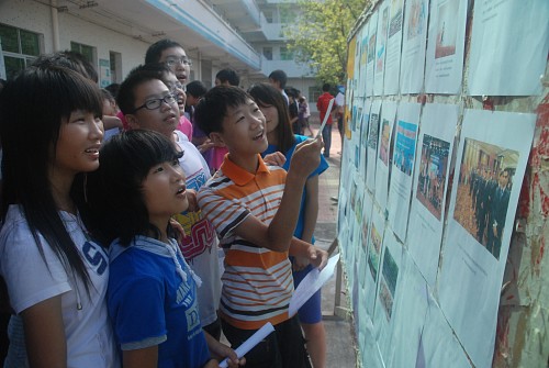 活动开始前30分钟,三队宣传组组员已开始了在教学楼架空层的准备工作。早上8点30分,各班学生在班主任的带领下分批参观了“亚运图片小展板”。“老师,这是什么?”、“这是啦啦队和志愿者”、“这是英雄花,也叫木棉花,是广州市的市花。”学生们好奇地看着展板上的图片,争先恐后地向老师发问,现场气氛轻松愉悦。