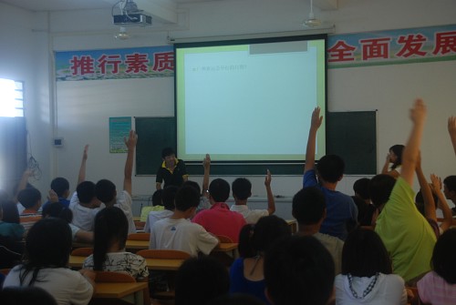 参观宣传小展板后,各班学生陆续来到多媒体电教室,准备进入本次宣传活动的第二个环节——多媒体教学。主持人首先通过播放亚运主题曲《蓝天》和亚运宣传短片,提高学生对广州2010亚运会的感官认识以及兴趣。通过ppt展示,主持人讲解了有关广州亚运会的办会宗旨、理念、目标以及吉祥物等,介绍了广州的著名三地标——“小蛮腰”新电视塔海心塔、“月光宝盒”省博物馆以及广州大剧院,还特别说明了亚运期间的观众入场退场礼仪。随后,主持人就刚才讲解的内容进行了有奖问答活动,学生积极抢答,气氛热烈。