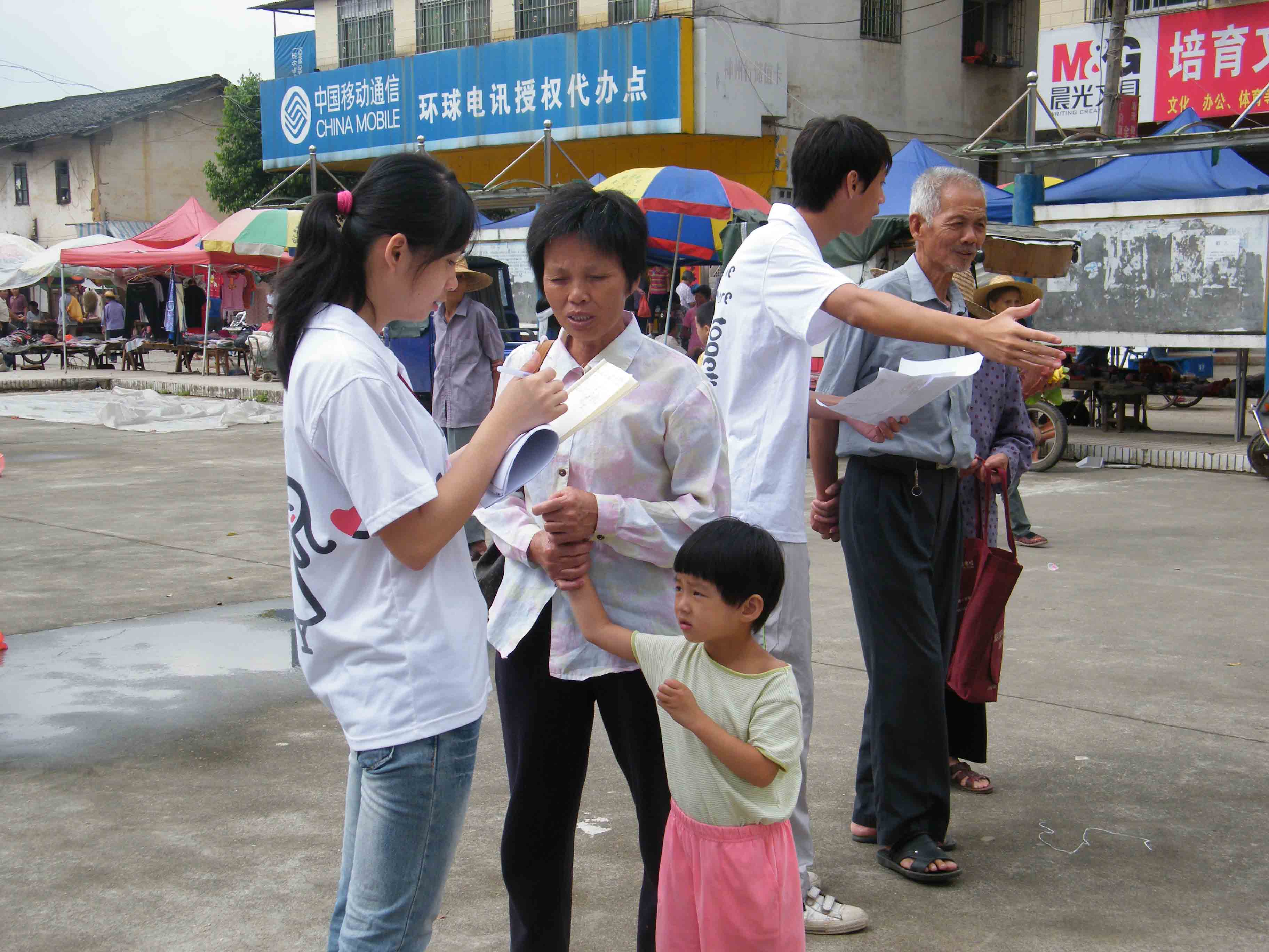 在交流上,星星们也遇到了一些小麻烦。由于当地百姓听不大懂粤语与普通话,一对一宣传时,组员与部分老伯伯、阿姨讲解时不禁有种“鸡同鸭讲”的感觉,这颇让组员头疼。当地的三位女生向星星们支招:一讲客家话,当地百姓大部分都能听懂;二一些上了年纪的大叔、阿姨们不是太会粤语,要多讲普通话,少讲粤语,讲话时尽可能放慢语速。恰好宣传组组员中曾同学是客家人,因此,每当遇到沟通存在较大障碍的时候,由她出马搞定。组员们在宣传的过程中,以通俗易懂的语言结合手势等,力争让叔叔阿姨们吸收防灾避险的知识。宣传的效果立马上升了不少。