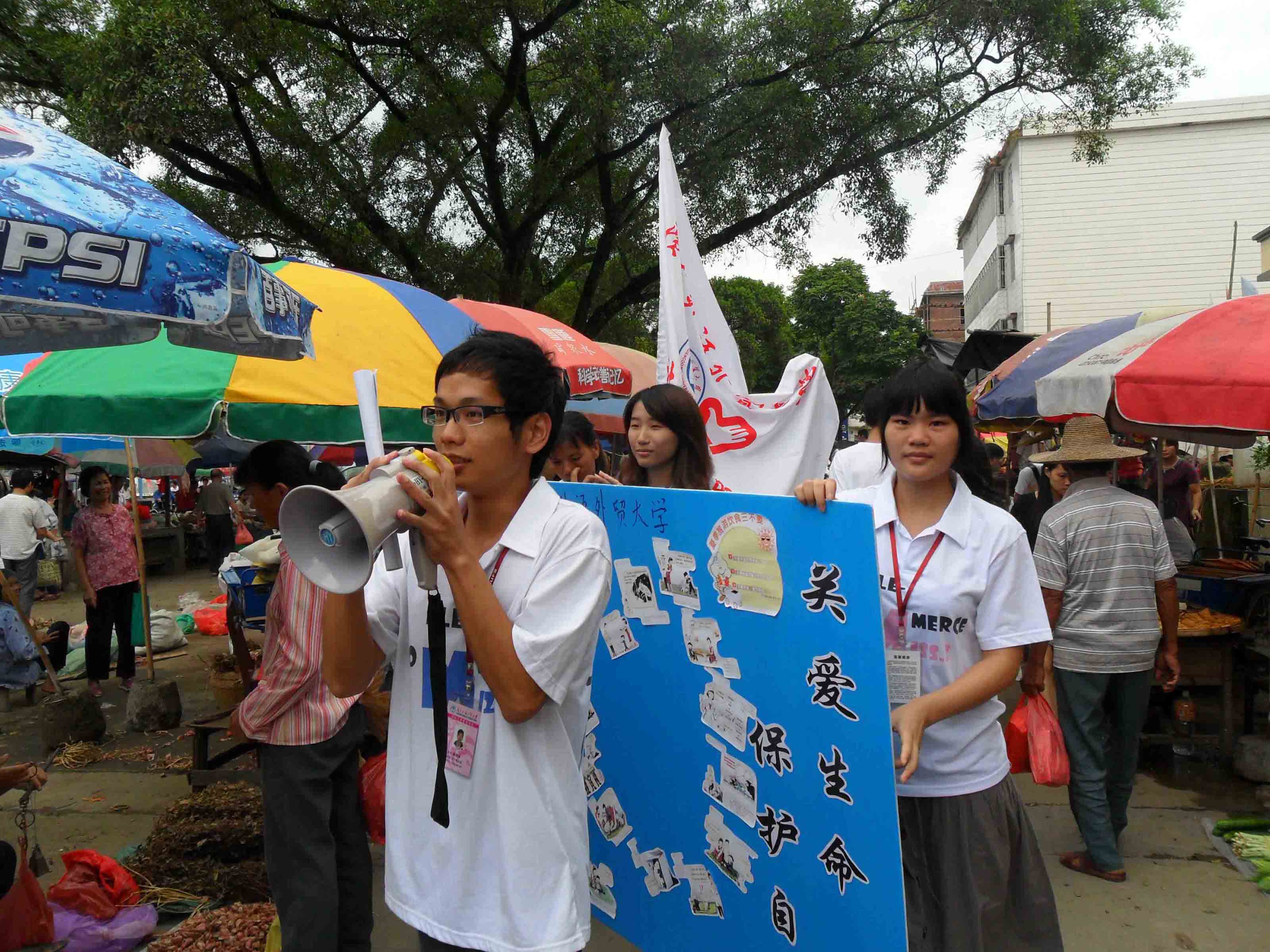 本网讯 “大家好,我们是来自广东外语外贸大学的学生,现在在马头中心小学做暑期社会实践活动。今天来到马头文化中心广场做宣传活动,欢迎大家有空过来看一看,谢谢!”星晴三下乡队伍的曾同学、黄同学拿着扩音器,身后的梁同学与林同学拿着广东外语外贸大学国际工商管理学院社会实践的旗子,一同在菜市场四处宣传在马头文化中心广场举行的防灾避险知识宣传活动。