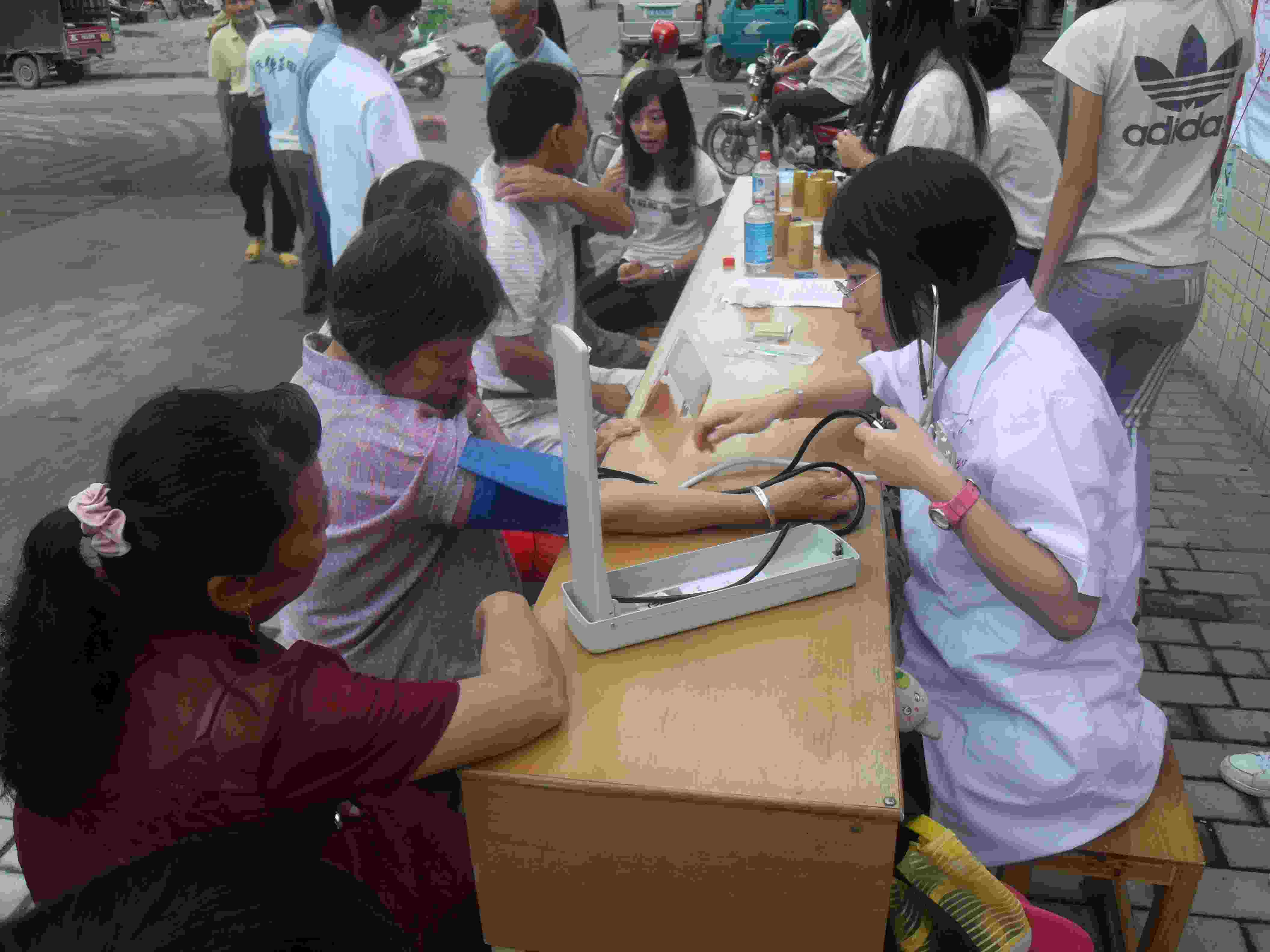 今天适逢六都镇的圩日,街上的人流络绎不绝。好奇的居民很快就包围了我们这个小小的义诊点,并向我们咨询着各种问题,在广中医队员的带领下,我们耐心地解答着。一场爱心风暴在六都镇大街火速展开。广中医的白衣天使们为镇民量血压、拔火罐,无处不显示出她们的专业技能与熟练技巧。广外的学子也不甘示弱,把广中医师姐教授的艾灸疗法纯熟地践行。