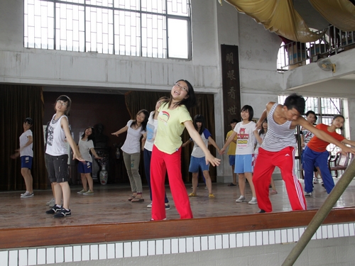 和修心养性的绘画不同,小老师林颖、李雅珺的舞蹈课程热烈奔放、激情四射。课堂设在了外海中学旁边的外海小学的体育馆,这里的小舞台让舞蹈课更有上台表演的气氛。两位老师精心选择了曾获“艾美奖”的热门美国电视电影《歌舞青春》结尾段集体舞,身体运动幅度大,节奏感强。女生们发挥天生的乐感,都能跟上老师的进度,男生则由于比较调皮,还需要带集体舞的老师的个别指导。偌大的体育馆内气氛活泼向上,展现了中学生们年青的朝气。