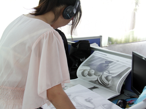 素描老师周晓纯为了第二课堂的素描课,做了很多前期准备工作。不仅一连两天在办公室完善自己的素描作品,还亲自到学校附近集市挑选教具——从“模特儿”——苹果、瓷瓶到素描用的附加光源,都经过精心准备,体现了她对艺术创作的执着与精益求精。课堂上,从理论到实践,她先给学生讲解素描的明暗五调子,再让学生握起普通的铅笔开始不普通的创作。这节课学习的是静物素描,由于是小班教学,老师到台下对学生进行一对一的教导。最让人动容的是老师的敬业精神与学生专心致志在画纸上描绘静物的神态。