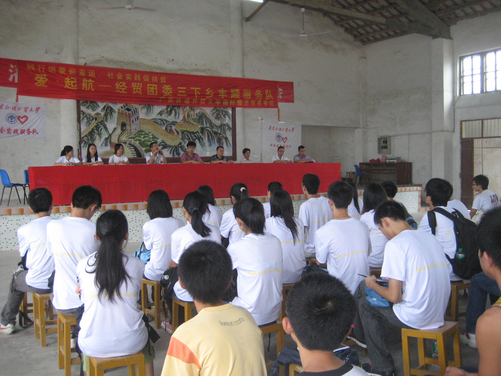 本网讯 7月21号早上8点30分,广东外语外贸大学经贸团委三下乡丰顺服务队和潘田中学的领导师生们在潘田中学礼堂举办了开学典礼,并由此正式开始了本次三下乡服务活动。潘田镇党委副书记张幸辉、潘田中学党支部书记、校长陈世云、潘田中学副校长李展鹏和我校经贸学院团委书记刘郎老师等嘉宾出席了本次开学典礼。
