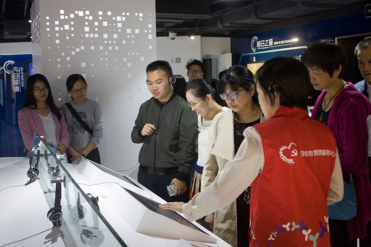 参观学习的第一站是深圳市党群服务中心。在讲解员的带领下,党员们沿着党群服务中心核心筒区所设置的时间轴,回顾了党的辉煌历史,学习了习近平总书记关于基层党建的重要指示和深圳城市基层党建工作的探索实践及经验,与社区工作人员围绕党建工作业务进行了交流,并且亲身体验了深圳“智慧党建”系统的部分功能。