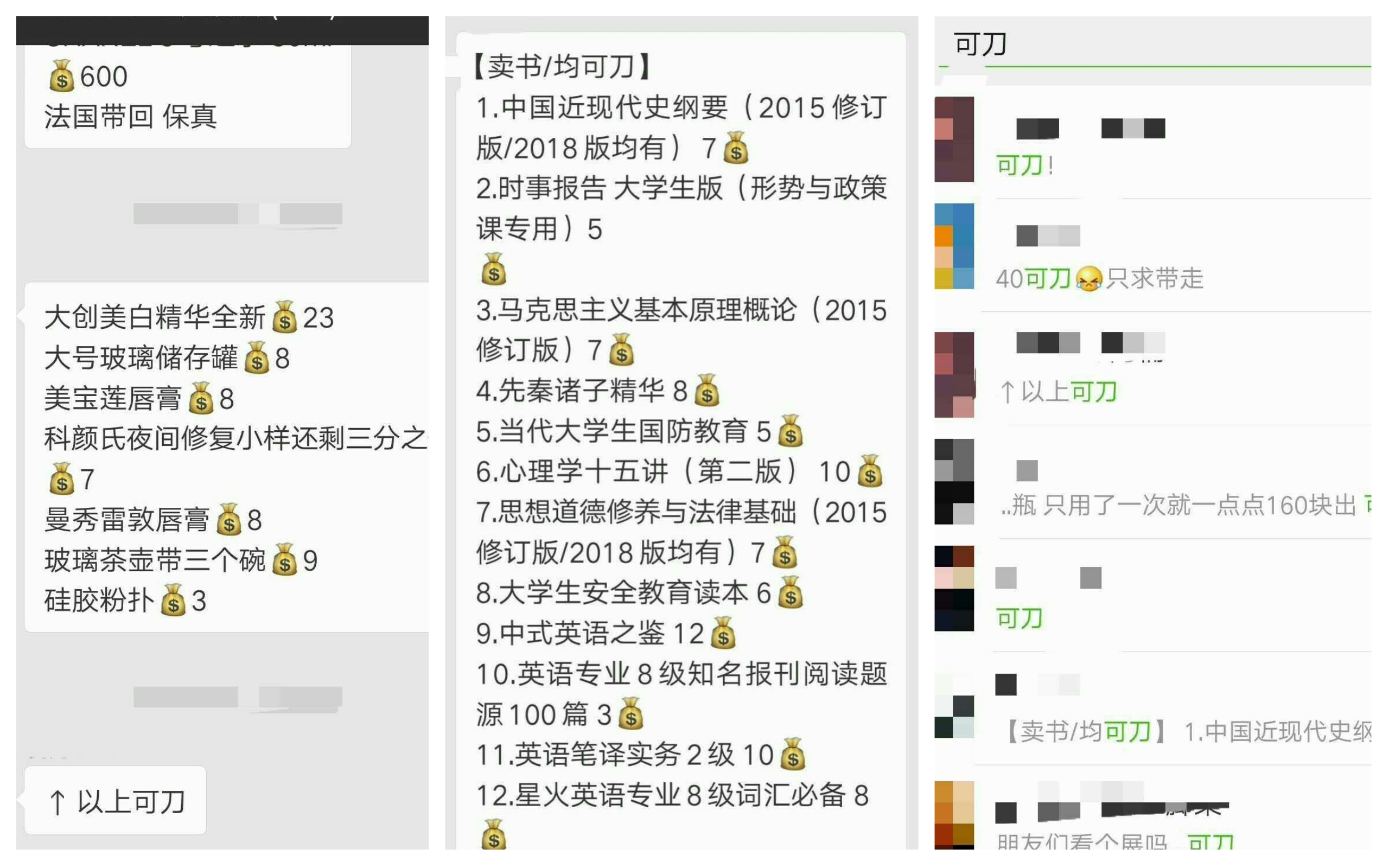 在一些二手交易信息中,标题或内容中加上"可小刀",就是代表可以小范围内还价的意思。林同学说,每每看到"可刀""可小刀"这样的字眼,她都很兴奋。学生买闲置的初衷大多数都是为了省钱,闲置品的价格比市面上的价格要低不少,"可刀"证明她还可以在这个本身就较低的价格上,再省下一笔钱买到合适的产品,这对于没有经济收入的学生来说,确实具有很大的吸引力。有时候急需某些物品,但周围的超市无法买到;淘宝网购,又需要漫长的物流配送时间。这种时候,闲置群就发挥了它最大的作用了。只要在群上问一句“有人要出xxx吗”?不出几分钟就会有卖家在下面回复回应需求。自打大一下学期加入了闲置群,每当日常生活中如果缺点什么的时候,林同学会立马想到群上面看看有没有人出售自己想要的东西。如果不是特别着急需要用到的东西,她也会先在群上发布自己的需求,然后每天上微信看闲置群的新消息。谷同学说:“上次我想在群里买一个收纳盒,可是晚了一步,有点可惜。没想到有人说她也有,问我还要不要,虽然只是一句小小的询问,但是却觉得很开心”。