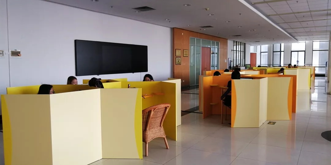 为降低噪音对学习的影响,研修室区域铺设了静音地胶,明亮宽敞的走廊边放置着两个可爱的沙发,学习累了的同学可以在此休息片刻。走廊左手边先是9间四人桌的大研习室,是同学们小组研习、课题讨论的绝好选择,其中还有3间附带用于投影讨论用的显示设备。17间个人研修间,独立安静而且设施齐全,实木研修桌、舒适的总统椅、插座一应俱全。