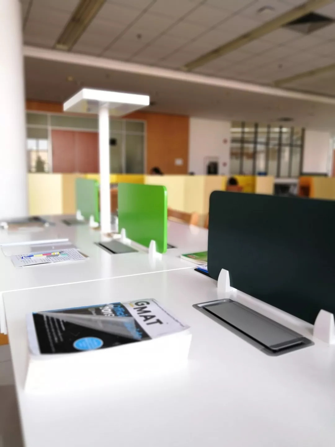 阅览区左侧一张张嫩黄与蛋黄色相间的蜂巢独立四人桌,桌边整整齐齐的摆放着一张张藤椅,独立安静且舒适。除此之外,每张桌子上还有三个两用电源插座,无论两孔还是三孔都可以轻松满足,以后再也不用受没电的困扰。阅览区右侧以前原木色的大桌子全部换成了清爽的纯白色桌子,每张桌子的中央有一盏大台灯,光线明亮柔和。桌子中间有一排绿色的格挡,为同学们提供了更加独立私人的空间。
