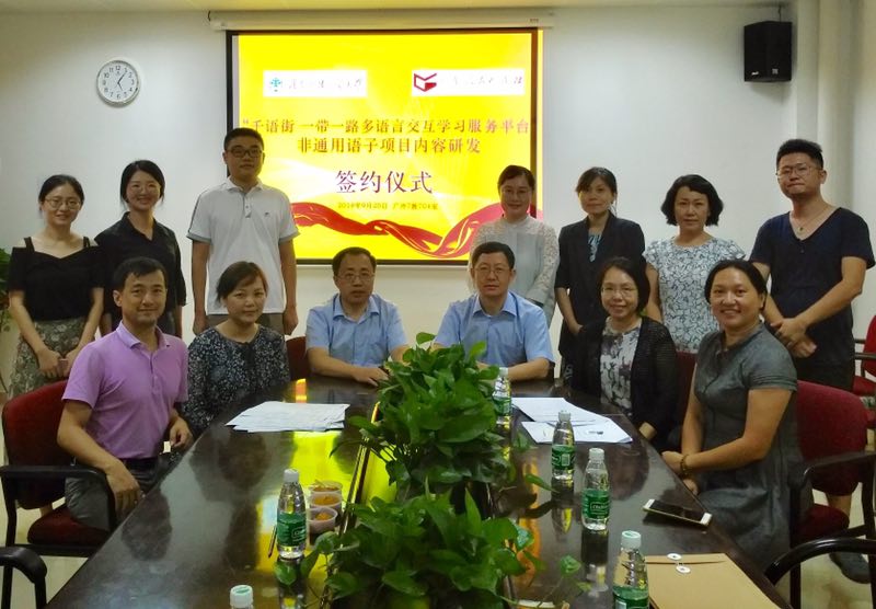 本网讯 9月20日下午,我校非通用语种教学与研究中心(以下简称“非通中心”)与广东人民出版社有限公司在七教704室举行了“千语街—‘一带一路’多语言交互学习服务平台非通用语内容研发”合作项目签约仪式,此次签约代表双方正式在非通用语教学方法和学习产品的研发方面开展合作。广东人民出版社总编钟永宁、副主编林小玲及各相关非通用语种专业教师等出席了此次仪式。