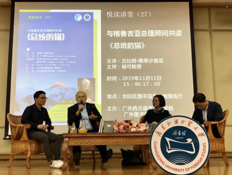 本网讯 从高加索山麓到黑海之滨的童话王国——格鲁吉亚,低调而又神秘。近年来,在习近平主席“一带一路”倡议的背景之下,这个古老的国家也越来越多的出现在我们的视野之中。格鲁吉亚不仅有着美丽的自然风光,同时也有着深厚的文学底蕴,发展至今涌现出许多优秀的作家。著名作家古拉姆·奥季沙里亚就是其中翘楚。9月,其代表作《总统的猫》中译本由我校西语学院院长杨可和博士生周兴武、“云山青年学者”黄天德博士合作翻译并出版,成为“一带一路国家当代文学精品译库”首推之作。11月11日,在北校区图书馆负一楼报告厅,由西语学院和图书馆共同主办的悦读讲堂,邀请到了古拉姆·奥季沙里亚先生本人与读者共读《总统的猫》。