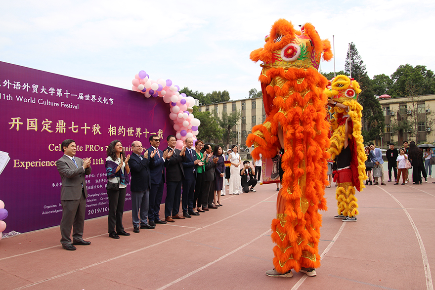 本网讯 10月31日,北校区操场上锣鼓声响,醒狮起舞,我校党委书记隋广军宣布第11届世界文化节正式开幕。来自30个国家的留学生奉上丰富多彩的世界美食,晚上云山会堂的文艺晚会为师生献上一场美轮美奂的视听盛宴。