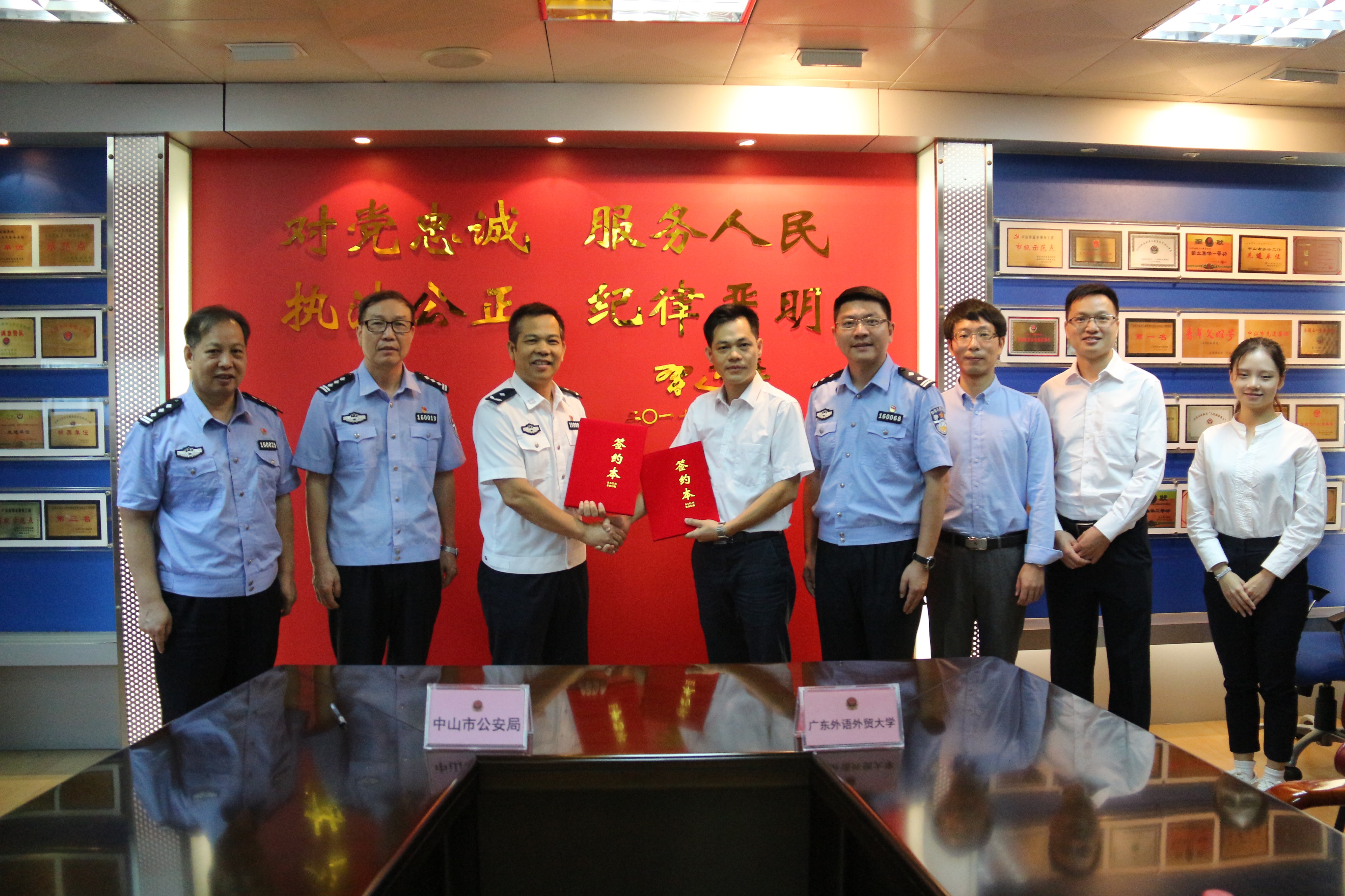 本网讯 10月15日,东语学院院长刘志强带队赴中山市公安局商谈人才合作事宜。中山市公安局党委委员、副局长冯永富、中山市公安局出入境管理支队政委刘捷迎接了东语学院一行并举行了会谈。双方签署了合作协议并为实践基地揭牌。
