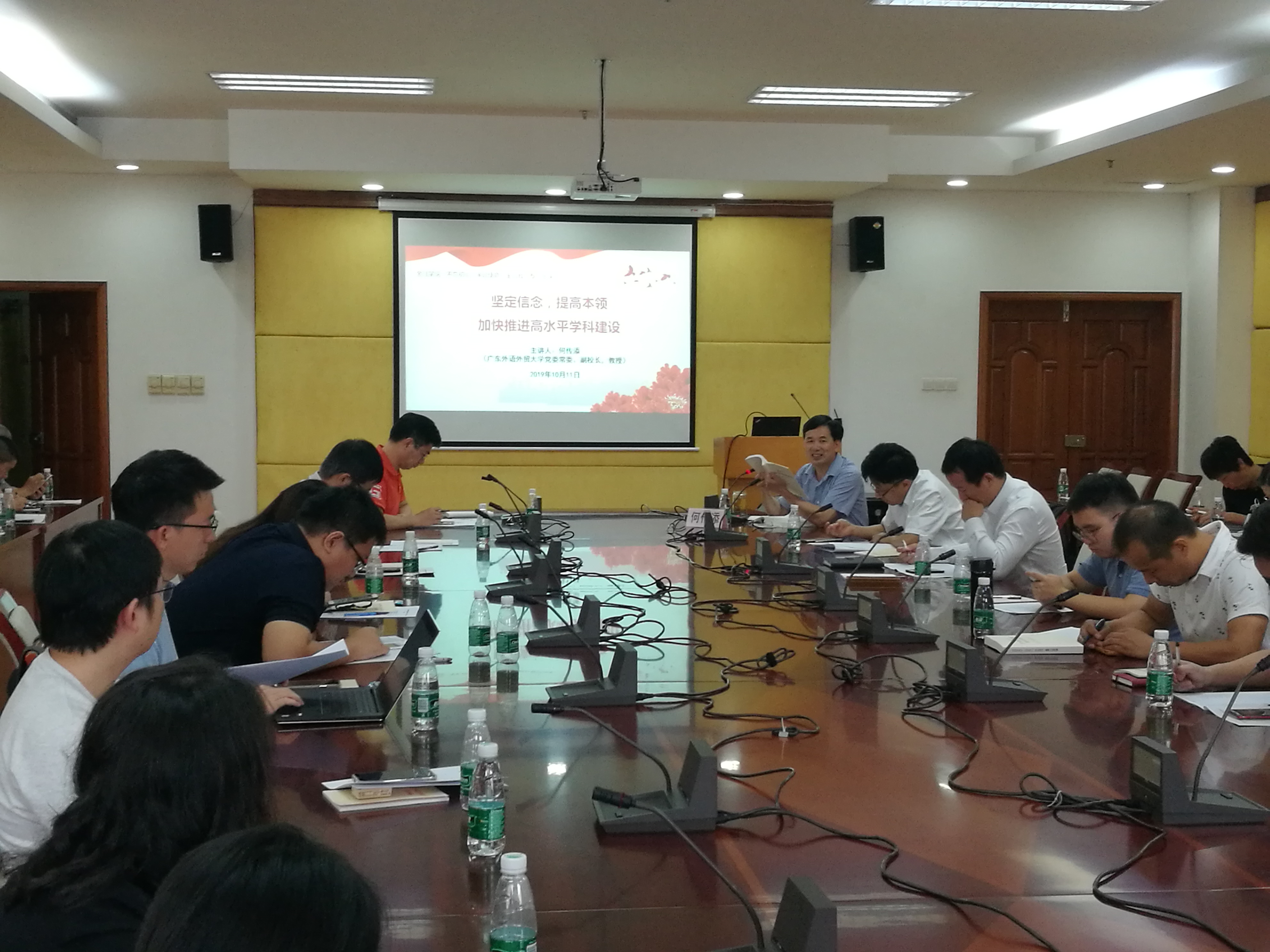本网讯 10月11日下午,我校金融学院党委在南校区行政楼第一会议室举办“不忘初心、牢记使命”主题教育学习活动。我校党委常委、副校长何传添教授以“坚定信念,提高本领,加快推进高水平学科建设”为题,为在场师生上了一堂生动精彩的主题党课。金融学院党政班子成员,全体教师党支部书记、支委,系主任、博士学位教师、副教授及以上职称教师,辅导员、组织员等师生代表40余人参与本次党课学习。