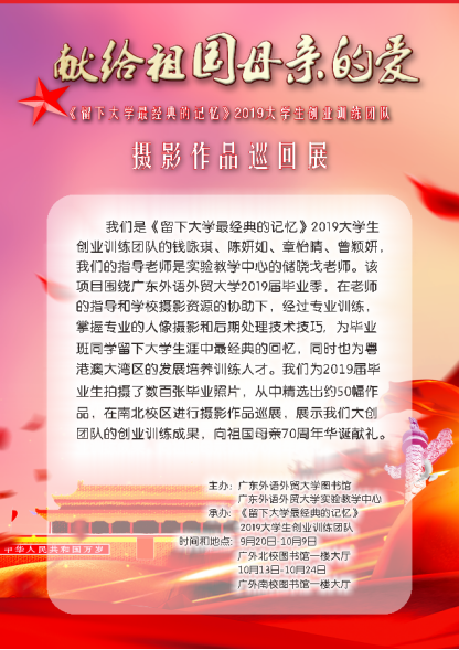 大学生创业训练项目是由实验教学部储晓戈老师指导,经过五个教学班发动动员的项目。其中,100多名同学自愿报名,通过提交作品竞标筛选,团队成员最后由新闻传播学院的钱咏琪、陈妍如、章怡晴、曾颖妍4位同学组成。该项目希望通过创业训练项目的参入,为粤港澳大湾区的建设培养专业影像前沿人才。同学们先期利用业余时间,经过老师精心指导和实践训练后,在南北校先后拍摄了大量的毕业班同学的专业人像照片。最终呈现在大家面前精挑细选的50幅作品,是她们以创业训练成果向祖国母亲献上的一份厚礼。