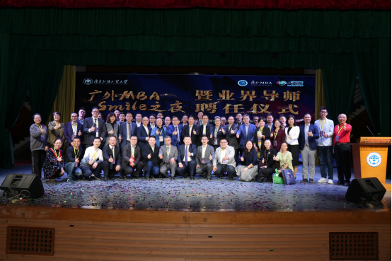 本网讯 近日,广外MBA“SMILE”之夜暨业界导师聘任仪式在我校北校区六教报告厅举行。来自各行业领域内具有影响力的业界精英共聚广外,受聘为业界导师,旨在开启广外MBA校内论文指导导师和校外企业导师指导的双导师制度,为学生的个人和职业发展提供更多帮助。我校副校长焦方太为业界导师颁发聘书,商学院党政领导班子成员、MBA中心全体老师、中国华南联盟及各兄弟院校成员、我校MBA在读学生及各界校友共计200余人共同参加活动。