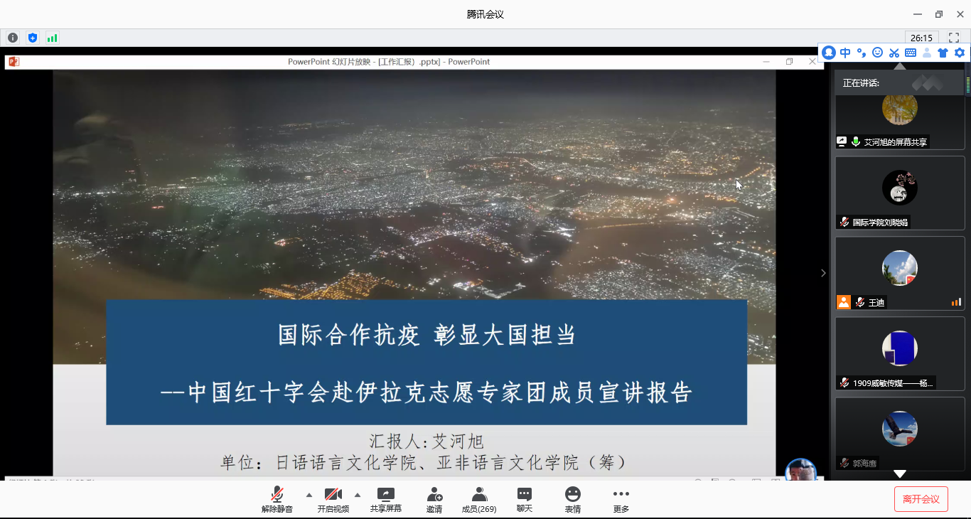 在国际学院的宣讲中,艾河旭作为中国红十字会援助伊拉克防控疫情志愿专家组成员之一,介绍了专家团队克服重重困难远赴伊拉克援助抗疫的事迹,从我国的制度优势、理念优势、医疗优势以及领导优势四个维度分析疫情防控中的制胜法宝。援伊抗疫52天,专家团队共进行了18场官方会谈,开展了27次视频培训和面对面交流指导,培训本地医务人员近1000余人;8次到医学城综合医院及新冠肺炎定点医院科室进行临床指导,深入全国9个省区实地指导当地疫情防控工作,开展了15场中资企业员工的新冠肺炎知识讲座,直接受益人数达800人,远程视频覆盖达11000人。通过官方会谈、经验交流、临床指导、宣传倡导、设备支持等一系列措施,专家组的援助有效遏制了当地疫情的蔓延势头,稳定了中资企业人心,提振了员工士气,弘扬了红十字精神,彰显了中国理念,加深了中伊友谊。