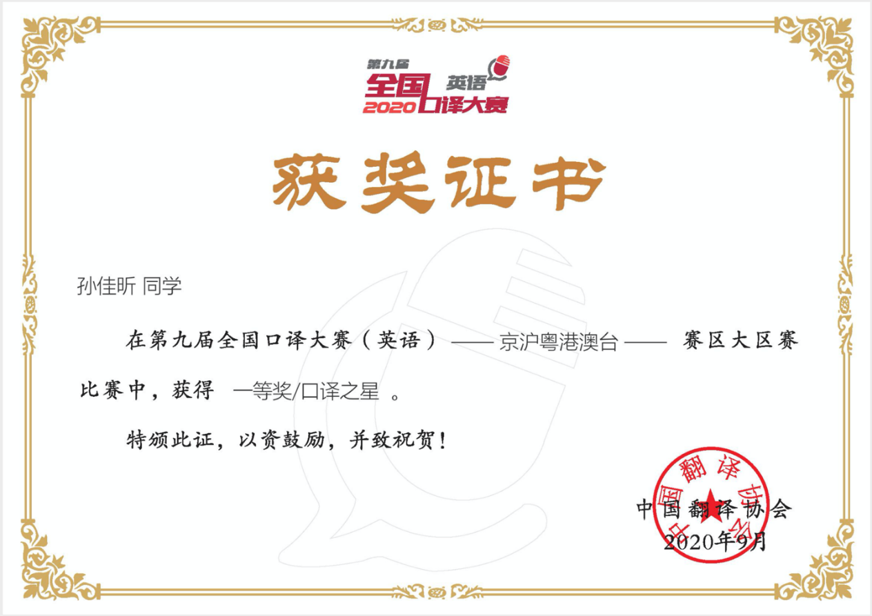 在第九届全国英语口译大赛京沪粤港澳台大区赛中,翻译学子孙佳昕荣获赛区第一名(一等奖)及口译之星,陈安昕荣获三等奖。