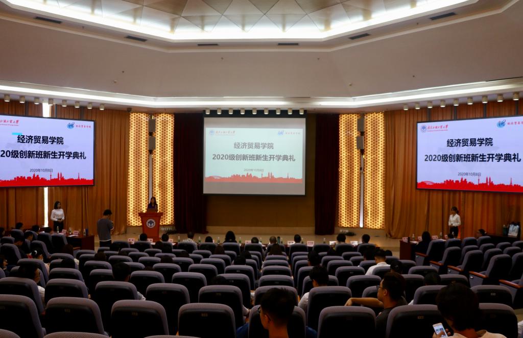 本网讯 10月8日,经济贸易学院2020年创新班新生开学典礼在南校区八角楼会议厅举行。我校校党委常委、副校长焦方太,教务处、国际合作与交流处等相关单位负责人,经贸学院领导班子、教师代表以及2020级创新班全体学生等参加开学典礼。
