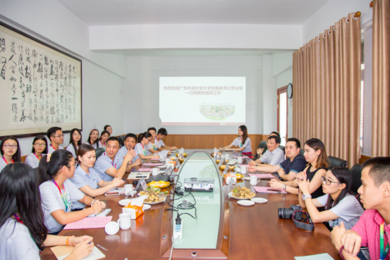 我校团委书记苏奕向大家介绍全校暑假社会实践活动情况,教育集团副总经理黄汐介绍我校团委和广外河源外校前期所做的工作。河源外校副校长冯艳、胡万江分别介绍了河源外校的发展历程及办学情况。服务队队长陈雨莹同学介绍了队伍的基本情况,认为同学们在实践中从学生身份转变成老师身份,对教学工作从生疏走向熟悉,对人生是一次宝贵的体验与成长;副队长伍云龙同学认为学生干部应怀有报国理想与担当,主动参加社会实践服务,大胆走进社会,了解国情。