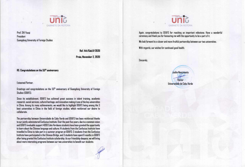 秘鲁圣玛利亚天主教大学校长阿尔贝托·布里塞尼奥·奥特加发来贺信及视频表达了对两校合作以及通过孔子学院这一平台的肯定。佛得角大学校长朱迪特·纳西门托也发来贺信及视频祝贺我校55周年校庆,她特别提及我校作为国内最优秀的以外语学科见长的院校之一,两校未来在学术合作上大有可为。她还强调,自佛得角大学孔院建成以来,超过4000名学生有机会学习中文及中国文化。