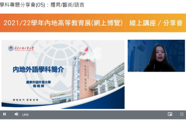 招生办主任杨晓辉就内地语言学科的发展建设及未来方向做了在线分享。杨晓辉以我校为例向香港学生介绍了内地外语学科的基本情况、培养要求、培养机制以及未来前景,以及我校的发展状况、办学特色及办学实力,并回答了学生的有关咨询。本次直播使香港学生对内地外语类专业的现状和我校的办学特色有了更深入的了解,取得了良好的宣传效果。