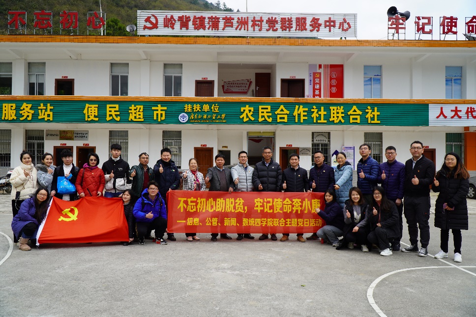 本网讯 为深入贯彻习近平总书记在决战决胜脱贫攻坚座谈会上的重要讲话精神,全面落实学校党委对口帮扶精准扶贫精准脱贫工作的部署要求,12月30日上午,信息学院党委、公管学院党委、新闻学院党委和数统学院党总支赴阳山县岭背镇蒲芦洲村开展“不忘初心助脱贫,牢记使命奔小康”四学院联合主题党日活动。