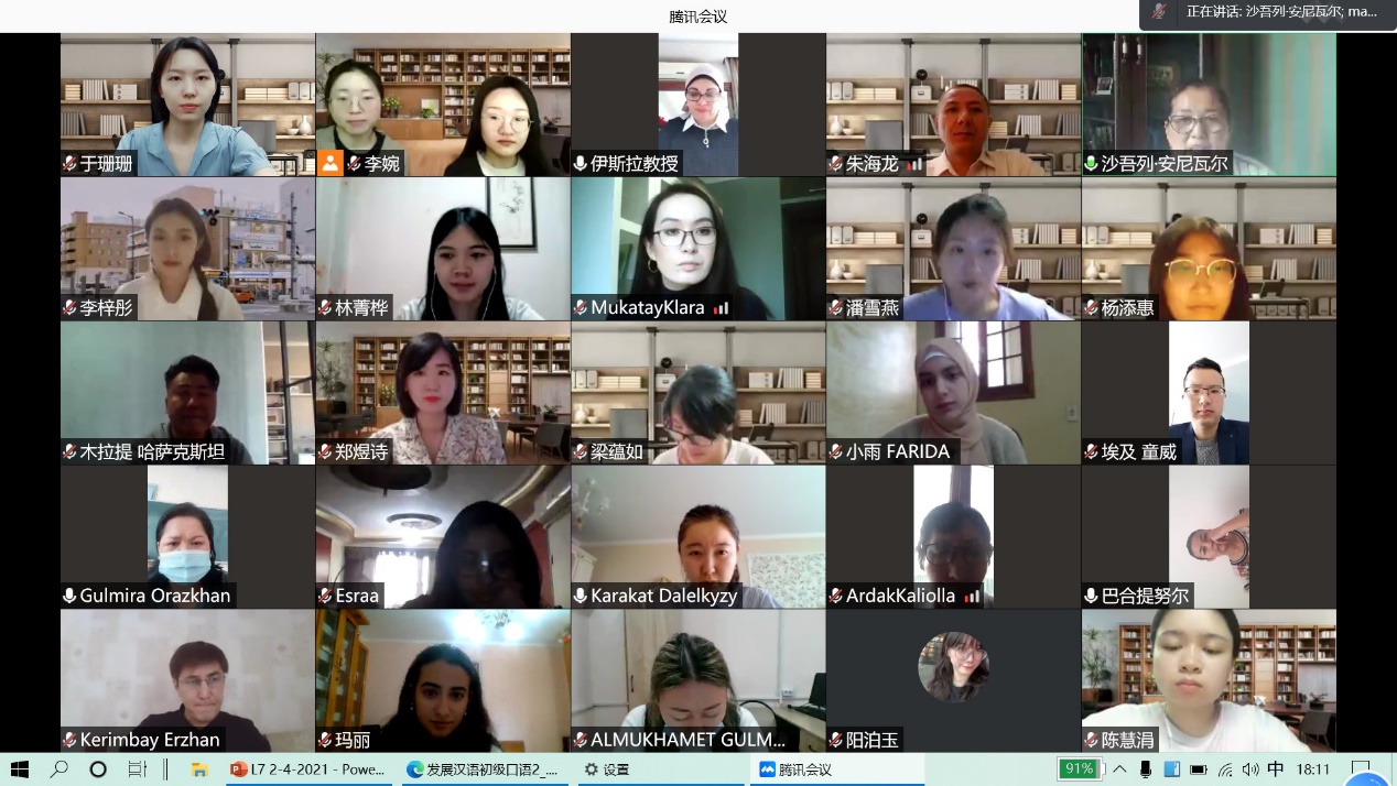研讨过程中,来自中国、哈萨克斯坦和埃及的骨干教师们分享教学心得。广外艾大孔子课堂的教师毛洁从语言教学、汉字教学和词汇教学三个方面分析了零基础对外汉语线上教学的难点。阿里法拉比哈萨克国立大学东方学系汉学教研室的教师柯拉热从历史发展、办学规模、师资力量、合作交流、课程设置、人才培养等多个角度出发,全面地介绍了学校的汉语教学情况。哈萨克斯坦国际哈中语言学院教师Alima分别从对外汉语课堂教学技巧和网络授课利弊分析两方面介绍了近期的授课情况。教师李婉和教师于珊珊提出授课过程中的交际互动十分重要,课堂要话题要做到与时俱进、紧密联系实际带给学生更好的课堂体验。艾因夏姆斯大学中文系教师Lamiaa表示教师需要保持线上、线下教学的同步互动,做到二者互相补充,努力实现更理想的教学效果。