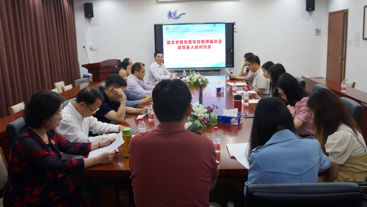 本网讯 近日,英文学院党委在北校区第七教学楼412会议室举办了年轻教师调研座谈会暨联系人结对仪式,正式启动英文学院党史学习教育“我为群众办实事”实践服务系列活动。英文学院和文科基地负责人、党员学科学术带头人代表、近三年入职的年轻博士教师等出席。