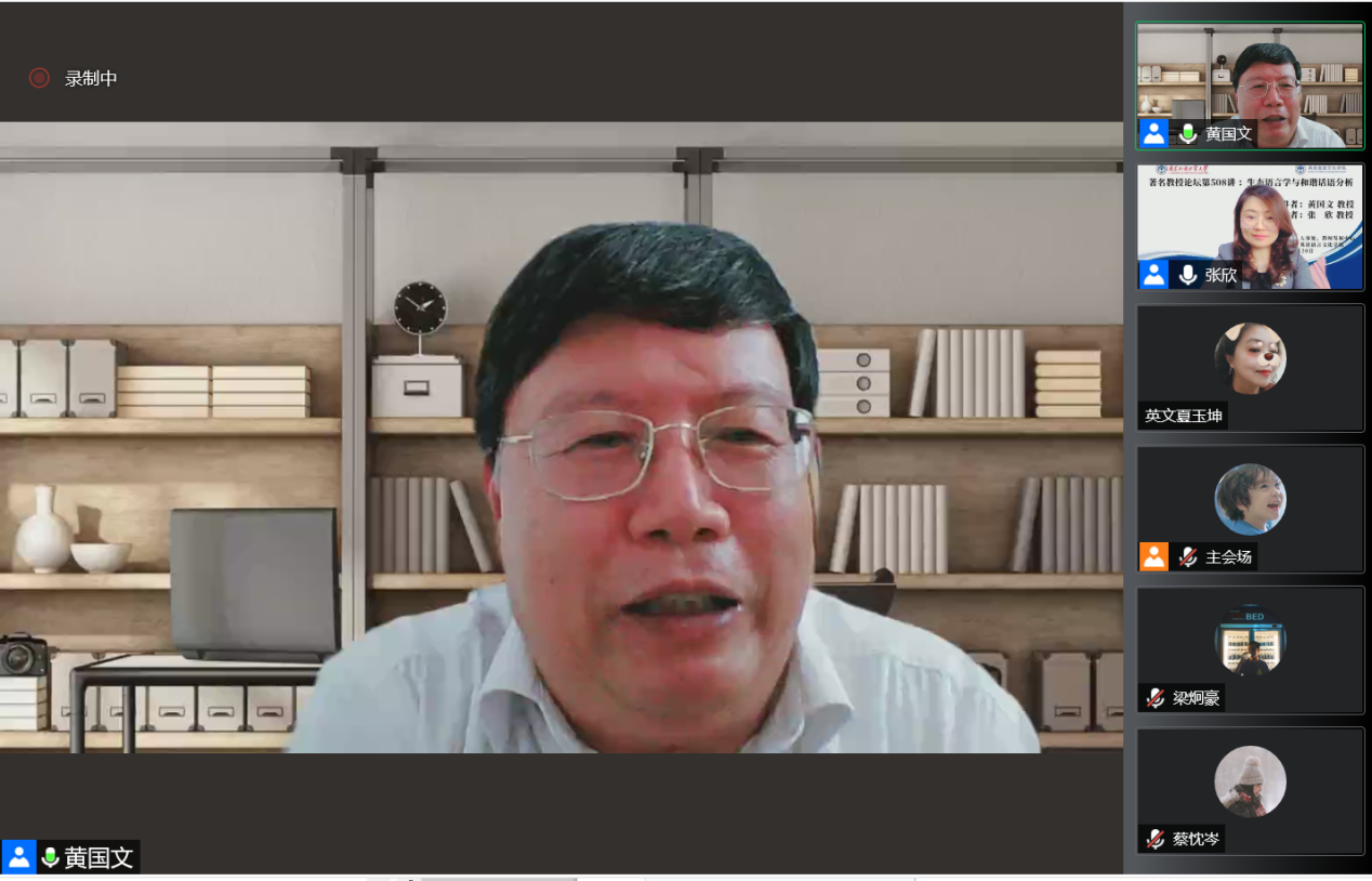 本网讯 5月20日下午,由教师发展中心主办,英语语言文化学院承办的著名教授论坛第508讲在腾讯会议线上举行,华南农业大学外国语学院院长黄国文作题为“生态语言学与和谐话语分析”的学术讲座。学院全体教师、研究生和学校其他感兴趣的师生在线参加了讲座。