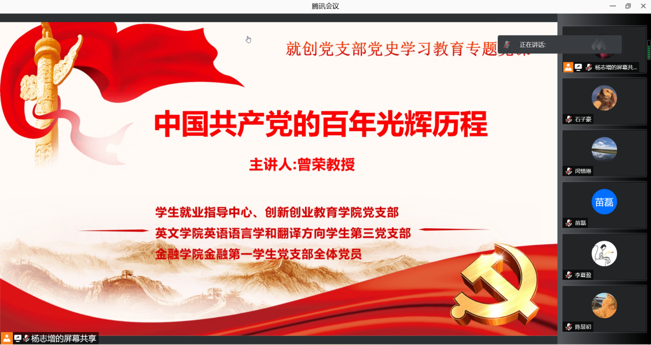 本网讯 为深入开展好党史学习教育,扎实推进“我为群众办实事”实践活动,学生就业指导中心、创新创业教育学院党支部与英文学院英语语言学和翻译方向学生第三党支部、金融学院金融第一学生党支部结对共建。三共建支部于6月24日下午联合举办了“师生共建共学,砥砺初心使命” 党史学习教育专题党课。本次党课主题为“中国共产党百年光辉历程”,由我校党史学习教育宣讲团成员、马克思主义学院教授曾荣担任主讲。