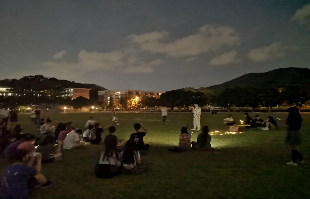 随着时间的流逝,晚霞褪去,天色渐晚,操场被黑夜笼罩,但热闹却丝毫没有消散。有时天气好,在璀璨的星空下,小尚会遇见小型晚会,一群人坐在草坪中间,围成圈,中间那个人抱着吉他吟唱,其他人跟唱并沉醉其中,什么也不想,就享受这片刻欢愉。小尚也会加入其中,她很喜欢这样轻松的氛围,你不认识我我不认识你,但却可以享受一样的快乐,共同丢掉沉积的烦恼。