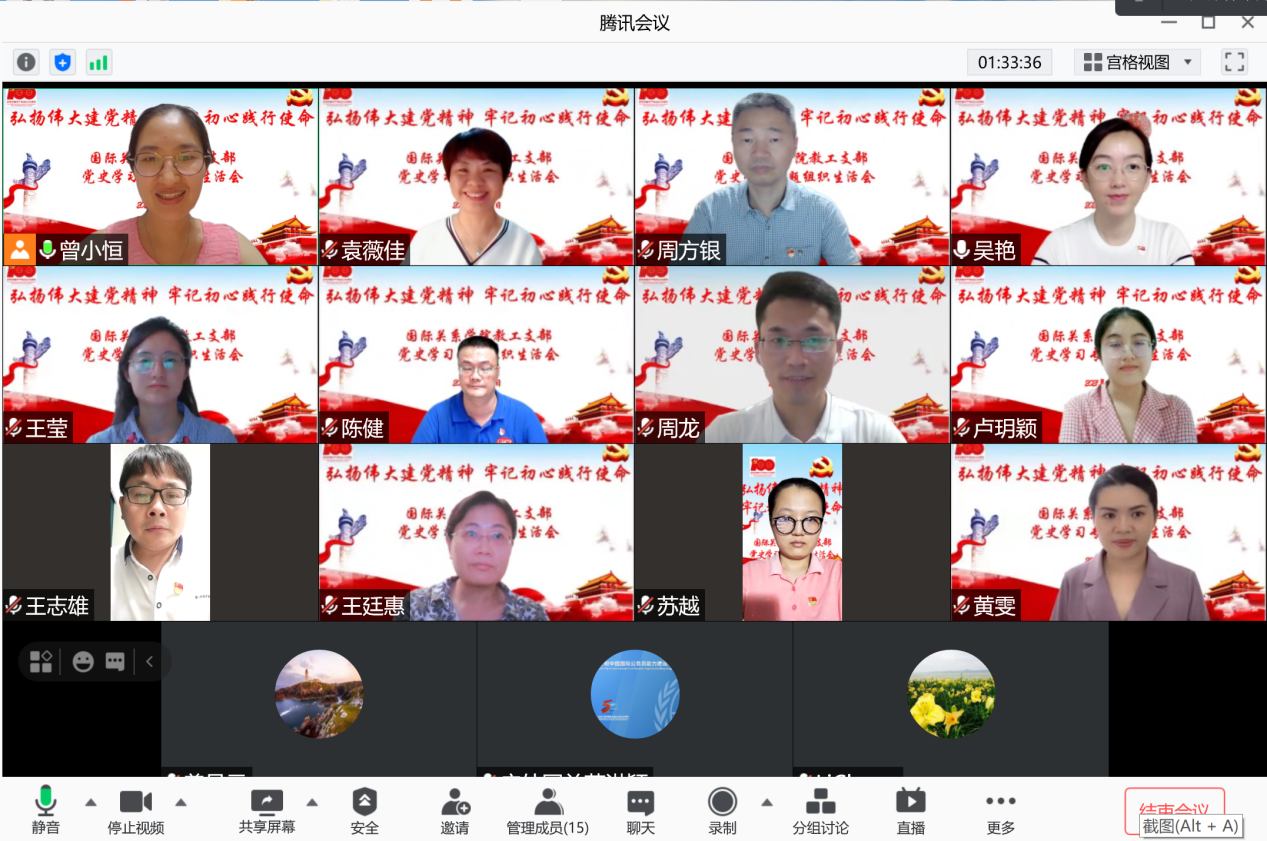 本网讯 7月15日晚,国关学院教工支部通过腾讯会议举行“弘扬伟大建党精神 牢记初心践行使命”党史学习专题组织生活会,会议由教工党支部书记周龙主持,校党史学习教育第六巡回指导组组长、校党委常委、副校长王廷惠参加本次会议并作总结点评。