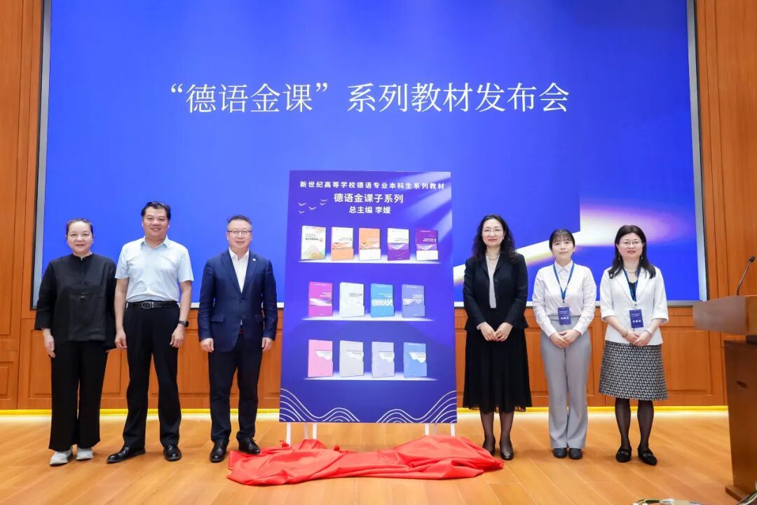 论坛现场举行了“德语金课”系列教材发布会。在场观众通过宣传视频了解了该系列教材的优势与特色。谢伟光副校长、王欣副校长、陈金诗教授、杨晓敏院长、王一佼副总编辑、李媛教授为“德语金课”系列教材揭幕。