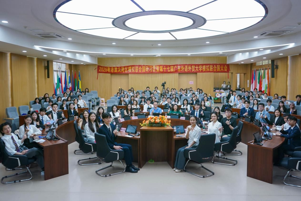 本网讯 4月16-19日,2026年第二届粤港澳大湾区模拟联合国研习营暨第十七届广东外语外贸大学模拟联合国大会在广东外语外贸大学大学城校区举办。本次活动由广东外语外贸大学主办,区域国别学院(国际关系研究院)、共青团广东外语外贸大学委员会和广东外语外贸大学模拟联合国协会承办,中共广州市委外事工作委员会办公室、广东省科技合作研究促进中心、广东外语外贸大学国际治理创新学院、广东国际经济协会、广东省青年科技创新研究院等共同支持。内地及港澳40余所高校及中学的169名师生代表齐聚广外,开启跨学科、跨地域、跨文化的全球治理探索征途。