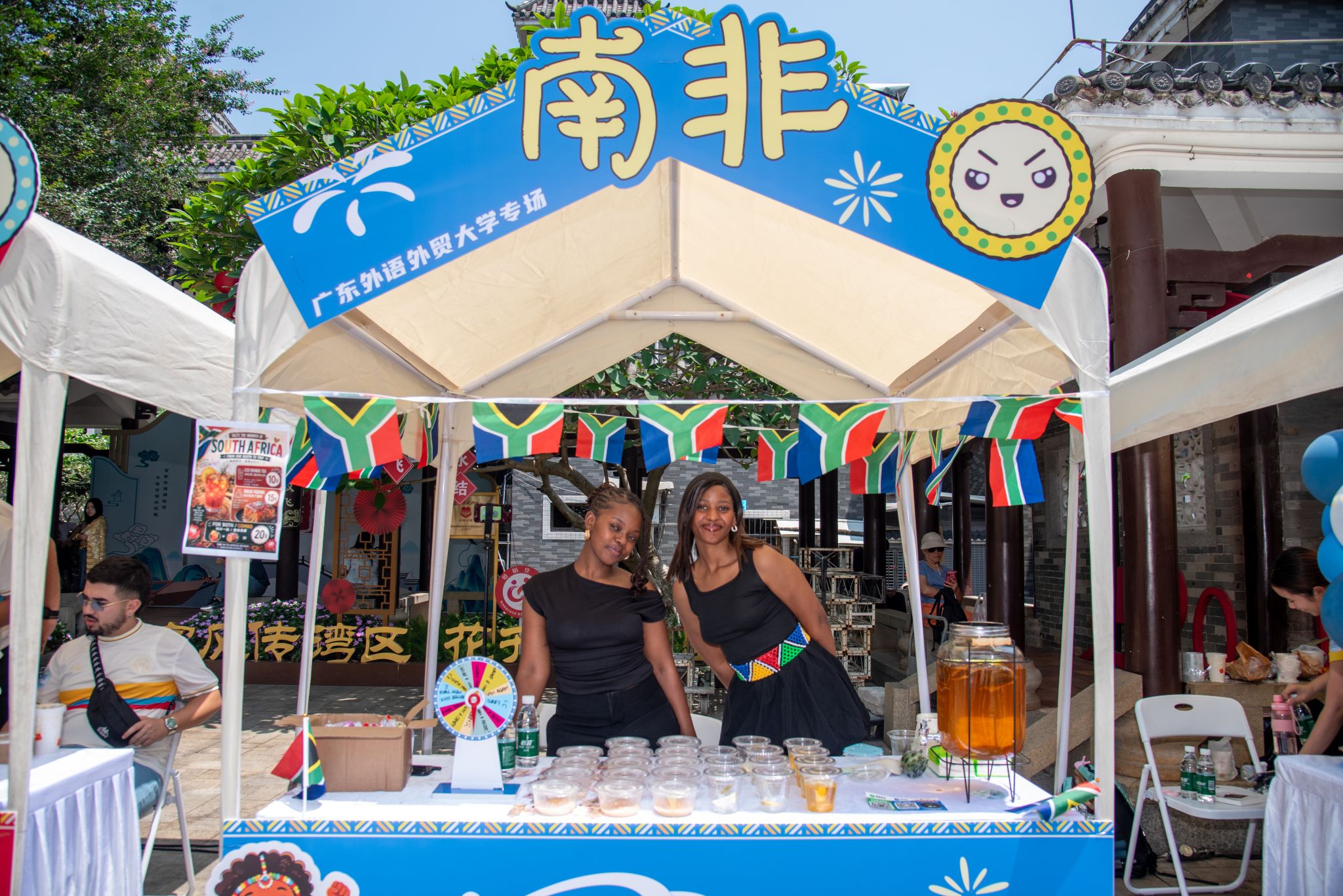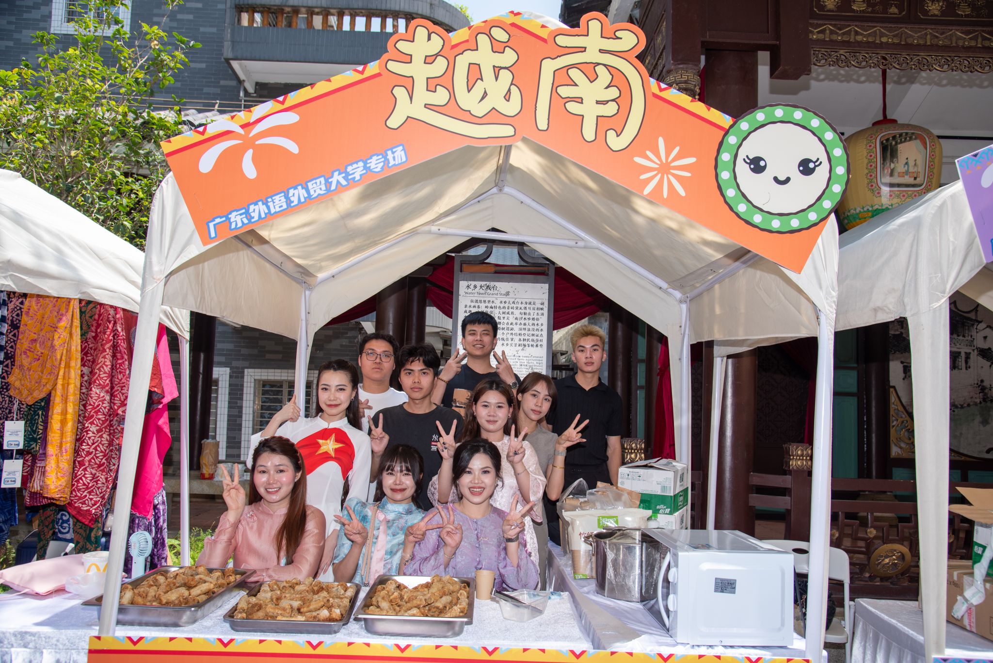 世界美食市集人气火爆,来自18个国家的留学生摊位带来越南春卷、泰国虾片、安哥拉烤肉串等特色美食,搭配传统乐器、异国游戏、手作互动,让市民“一站式”体验全球风情。我校“百千万工程”特色展位开展书画临摹、陶瓷手工等体验,同时特别设置双百行动结对地清新区宣传摊位,开展文旅宣传与农产品展销,以校地联动助力乡村振兴,充分展现高校服务地方发展、赋能乡村建设的责任与担当。