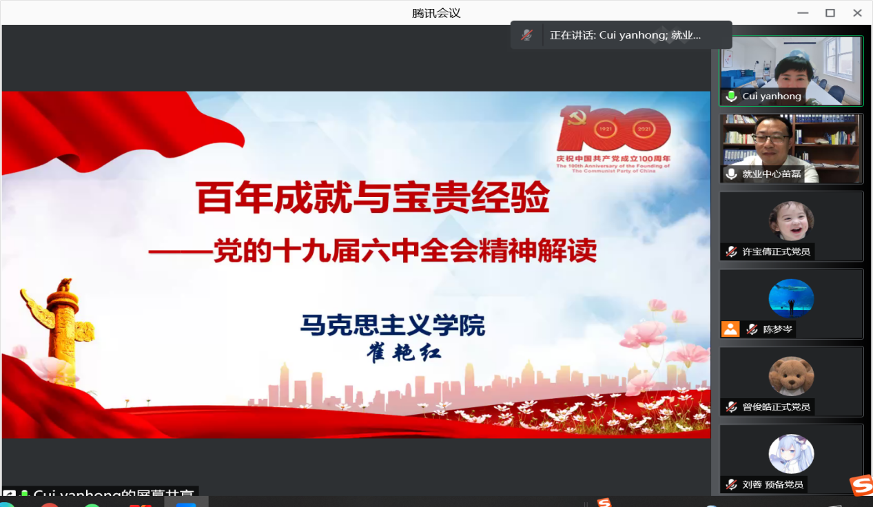 与会党员纷纷表示要把思想和行动统一到全会精神上来,把学习贯彻成效体现在日常学习、工作中。此次辅导报告会也是“师生共建共学,砥砺初心使命”活动的重要组成部分。报告会由我校学习贯彻党的十九届六中全会精神宣讲团成员、马克思主义学院副院长崔艳红担任主讲。三共建党支部全体党员参会学习。
